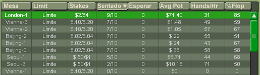 Las cabezas de las columnas le permiten clasificar por cierto atributo. Por ejemplo, haciendo clic en Avg Pote clasificará la lista de mesas por el el tamaño promedio de los potes, de más alto a más bajo. Esto es útil si usted quiere jugar contra otros jugadores que están dispuestos a apostar mucho dinero en cada mano. Haciendo clic otra vez clasificará de más bajo a más alto, que lo ayuda a encontrar una mesa con jugadores más conservadores.